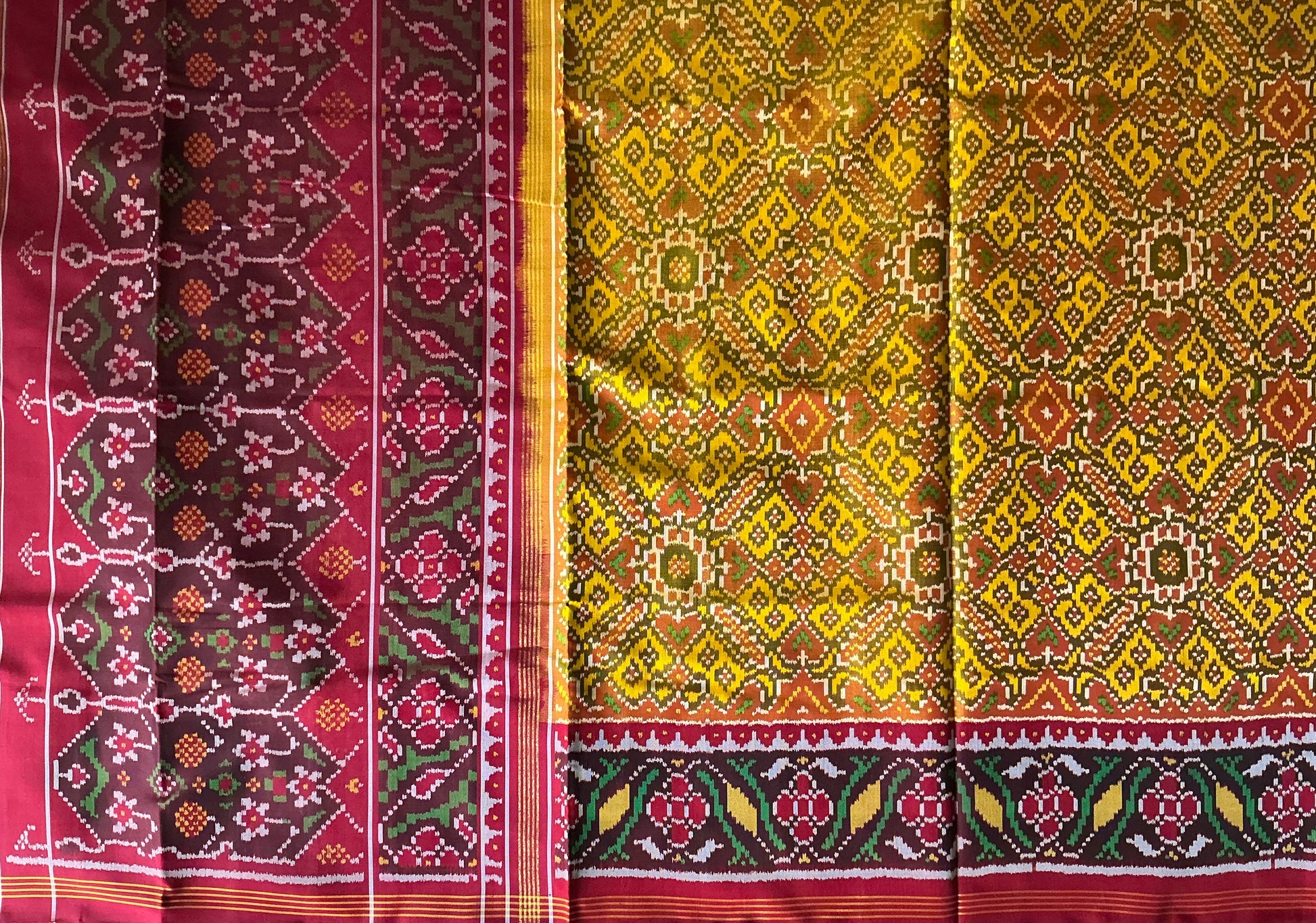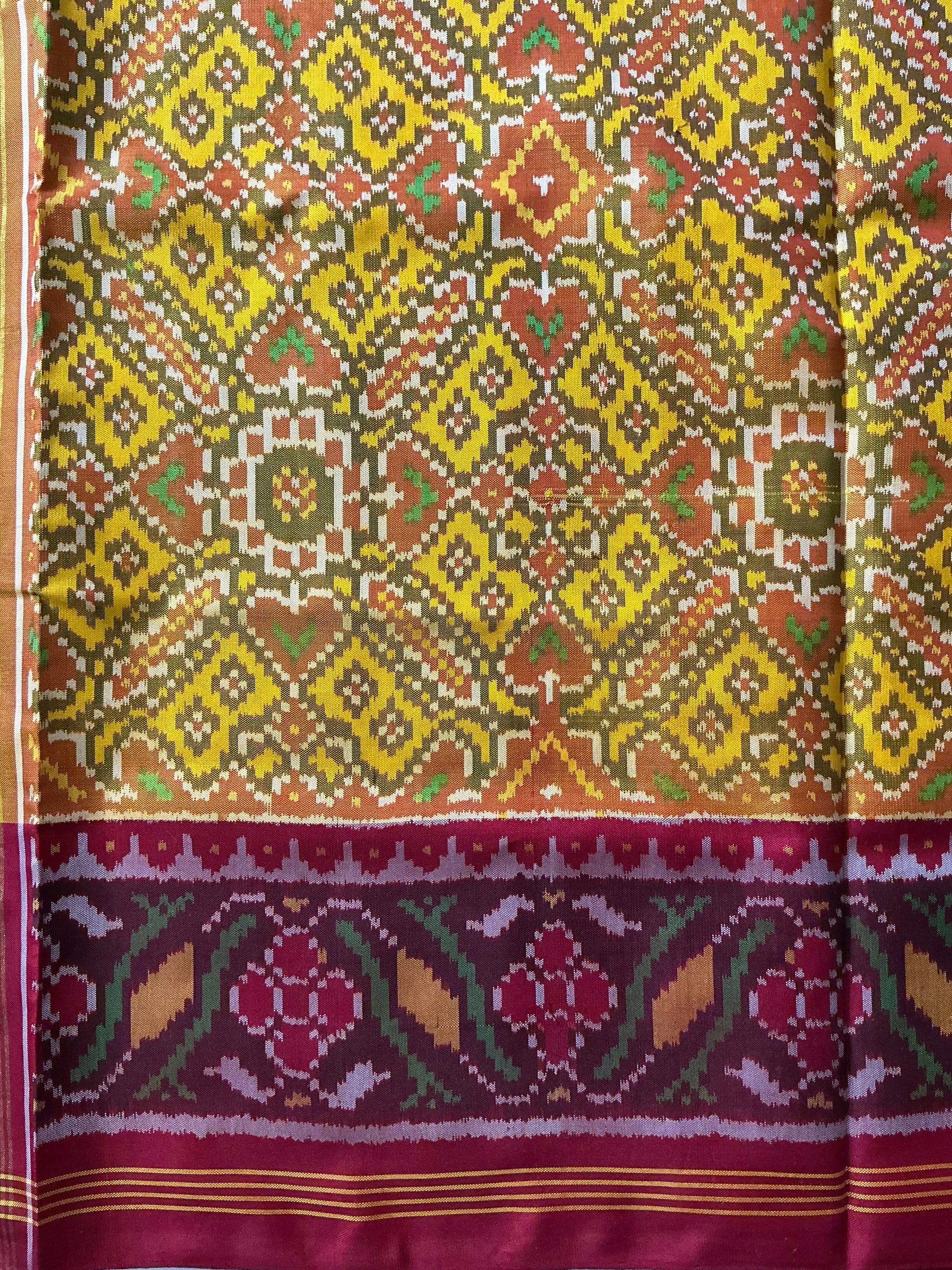Manek Chowk yellow colour Tal, with beautiful tree full border,Patan Patola First Copy Semi Ikkat Patola Saree.